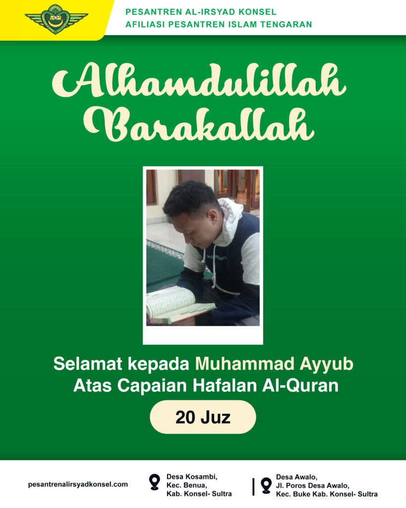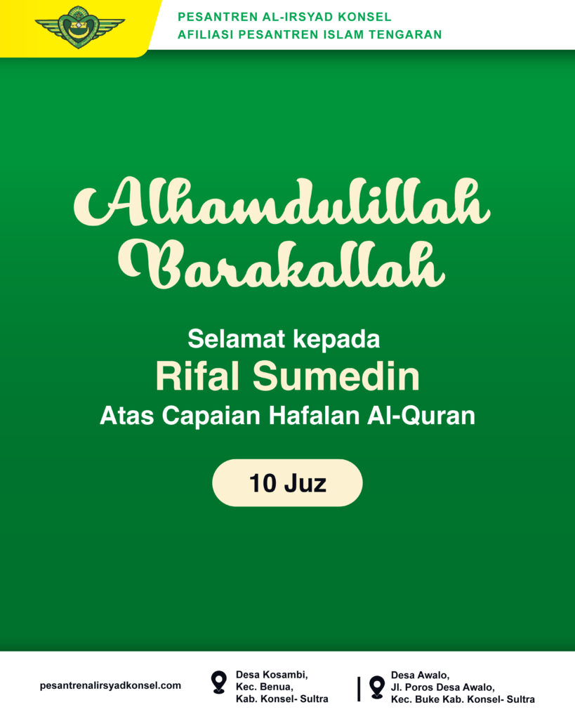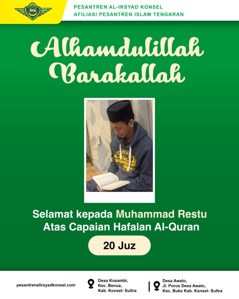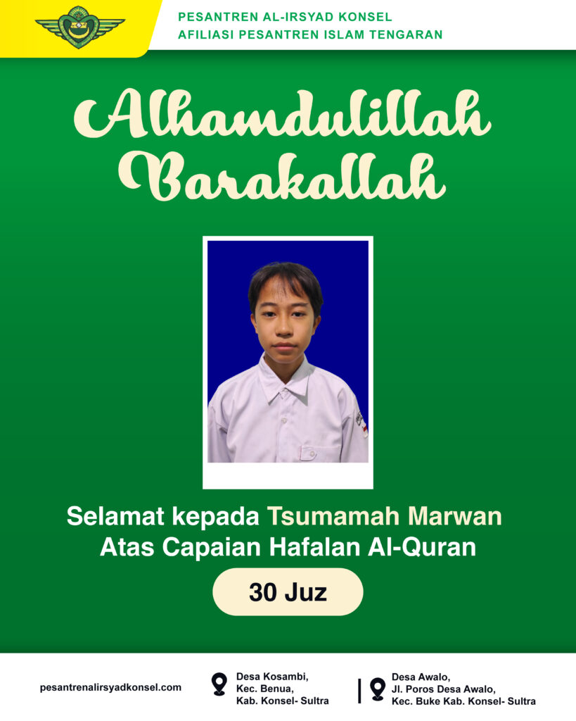 Pencapaian ini bukan sekadar angka, melainkan hasil dari kedisiplinan murojaah (mengulang hafalan) dan bimbingan intensif dari para asatidzah di Pesantren Al-Irsyad Konsel. Pesantren yang memiliki cabang di Desa Kosambi (Kec. Benua) dan Desa Awalo (Kec. Buke) ini terus berkomitmen mencetak generasi Qur’ani yang tidak hanya menghafal, tetapi juga berakhlak mulia.